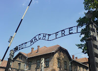 Above: The entrance to Auschwitz, with the German "Arbeit macht frei" (work shall set you free).