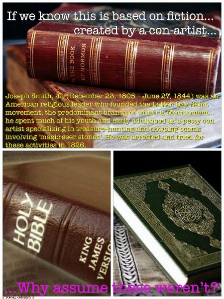 Read what's in their scriptures, which they still, to this day, believe are the most perfect words of their (racist) God: BOOK of MORMON 1 Nephi 11:13 (Mary): "She was exceedingly fair and white." 1 Nephi 12:23 (prophecy of the Lamanites): "Became a dark, and loathsome, and a filthy people, full of idleness and all manner of abominations." 1 Nephi 13:15 (Gentiles): "They were white, and exceedingly fair and beautiful, like unto my people [Nephites] before they were slain." 2 Nephi 5:21: "A sore cursing ... as they were white, and exceedingly fair and delightsome, that they might not be enticing unto my people the Lord God did cause a skin of blackness to come upon them." 2 Nephi 30:6 (prophecy to the Lamanites if they repented): "Scales of darkness shall begin to fall ... they shall be a white and delightsome people" ("white and delightsome" was changed to "pure and delightsome" in 1981). Jacob 3:5 (Lamanites cursed): "Whom ye hate because of their filthiness and the cursing which hath come upon their skins." Jacob 3:8-9: "Their skins will be whiter than yours ... revile no more against them because of the darkness of their skins." Alma 3:6: "And the skins of the Lamanites were dark, according to the mark which was set upon their fathers, which was a curse upon them because of their transgression and their rebellion." Alma 3:9: "Whosoever did mingle his seed with that of the Lamanites did bring the same curse upon his seed." Alma 3:14 (Lamanites cursed): "Set a mark on them that they and their seed may be separated from thee and thy seed." Alma 23:18: "[Lamanites] did open a correspondence with them [Nephites] and the curse of God did no more follow them." 3 Nephi 2:14-16: "Lamanites who had united with the Nephites were numbered among the Nephites; And their curse was taken from them, and their skin became white like unto the Nephites and ... became exceedingly fair." 3 Nephi 19:25, 30 (Disciples): "They were as white as the countenance and also the garments of Jesus; and behold the whiteness thereof did exceed all the whiteness ... nothing upon earth so white as the whiteness thereof ... and behold they were white, even as Jesus." Mormon 5:15 (prophecy about the Lamanites): "For this people shall be scattered, and shall become a dark, a filthy, and a loathsome people, beyond the description of that which ever hath been amongst us." Pearl of Great Price Moses 7:8: "A blackness came upon all the children of Canaan." Moses 7:12: "Enoch continued to call upon all the people, save it were [i.e., except] the people of Canaan, to repent." Moses 7:22: "For the seed of Cain were black and had not place among them." Abraham 1:21: "King of Egypt [Pharaoh] was a descendant from the loins of Ham, and was a partaker of the blood of the Canaanites by birth." Abraham 1:27: "Pharaoh being of that lineage by which he could not have the right of Priesthood." (emphasis added to above citations). Mormons still, to this day, believe that the Book of Mormon is the most perfect book ever written in the history of mankind. Those blatantly racist 19th Century myths, used to justify slavery and genocide, are still published in the Book of Mormon and distributed around the world by the worlds biggest army of missionaries. Every word of the Book of Mormon is still believed to be perfect' by Mormons. Long after the 21st Century DNA physical evidence debunked every one of those bogus racist myths Mormon doctrine is STILL founded upon. Contrary to their carefully crafted official legal statement on denouncing racism, published by CNN in todays puff piece.