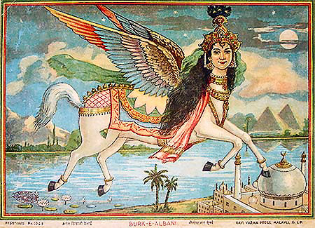 Mr. Mohammed, the pedophile, apparently flew off into Heaven on a winged horse that had the name Buraq. It seems that Heaven not only has invisible magic bird people , it has gravity defying flying horses . I gotta get me one of them flying steeds. Come to think of it, one of those young wives might be useful. At least Islam added wings to the horse that Mohammed used to get to heaven. In Christianity, angels (magic flying bird people) did have wings, but christian horses did not have wings. |